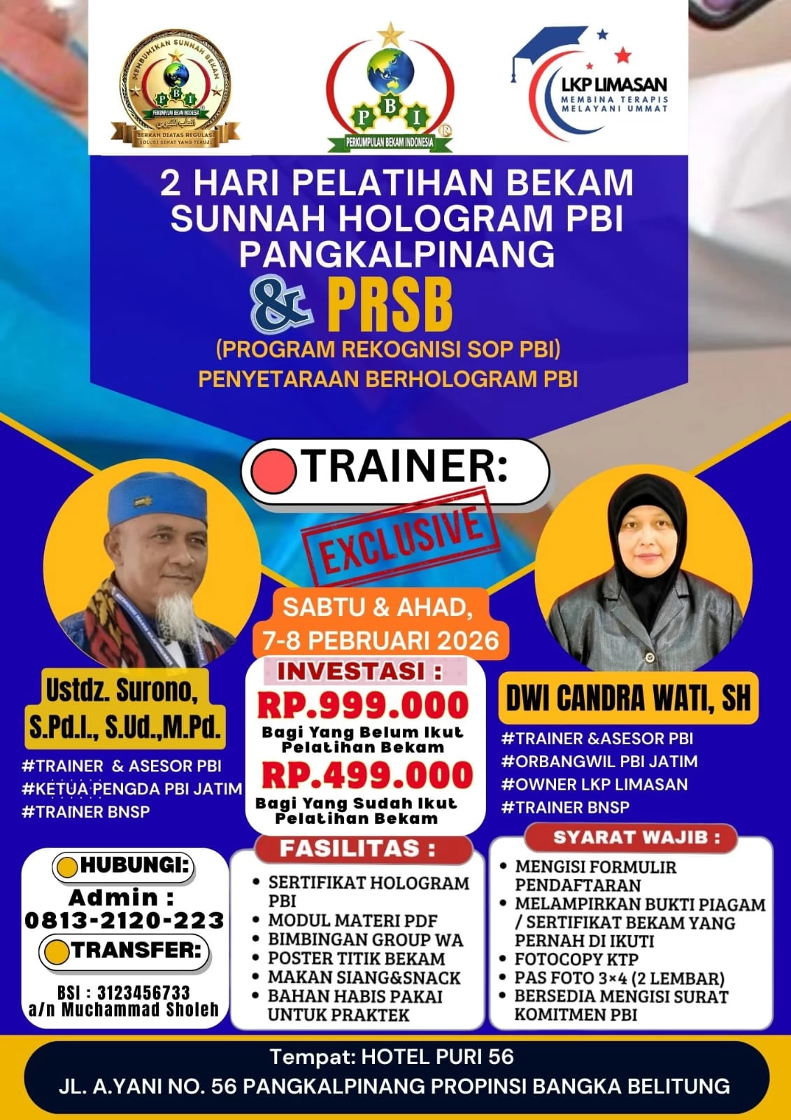 Pelatihan Bekam Sunnah Bersertifikat PBI Nasional di Pangkalpinang merupakan program SPECIAL Awal Tahun 2026 yang dirancang khusus bagi Anda yang ingin mendalami ilmu bekam secara ilmiah, syar’i, profesional, dan sesuai standar nasional. Program ini bukan sekadar pelatihan biasa, melainkan investasi keilmuan dan profesi jangka panjang dengan pengakuan resmi dari Perkumpulan Bekam Indonesia (PBI) sebagai mitra Kementerian Kesehatan.